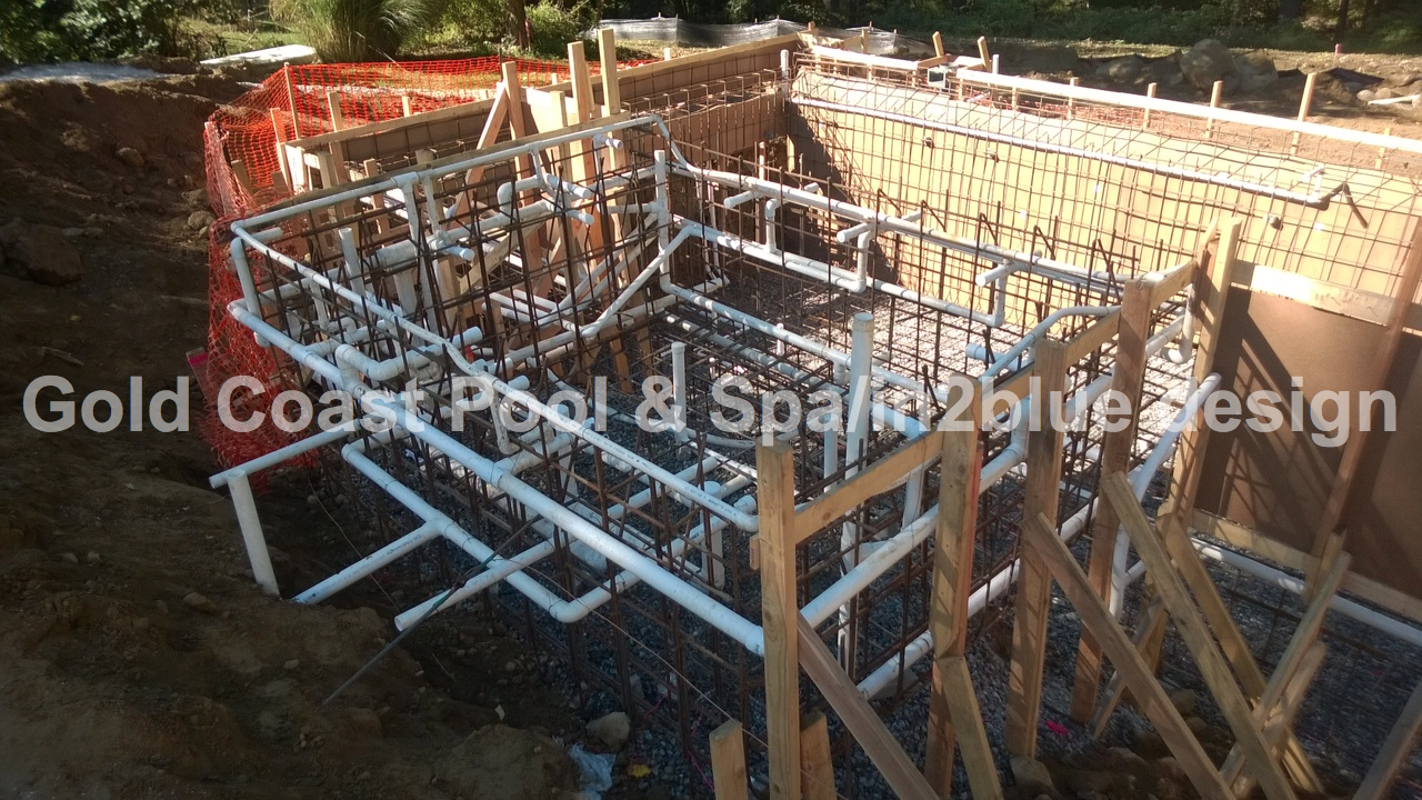 At this point your plans have been approved, your permits have been secured and the Gold Coast Pool & Spa team is ready to make your dream come true. The dig begins by forming out the inital shape of the future structure. Next, using transits and other engineering devices we will get all our exact elevations and depths to conform to the specifications of your plans. Lastly, a 3"-6" layer of gravel is installed, the gravel allows for proper drainage underneath the concrete shell of the pool.